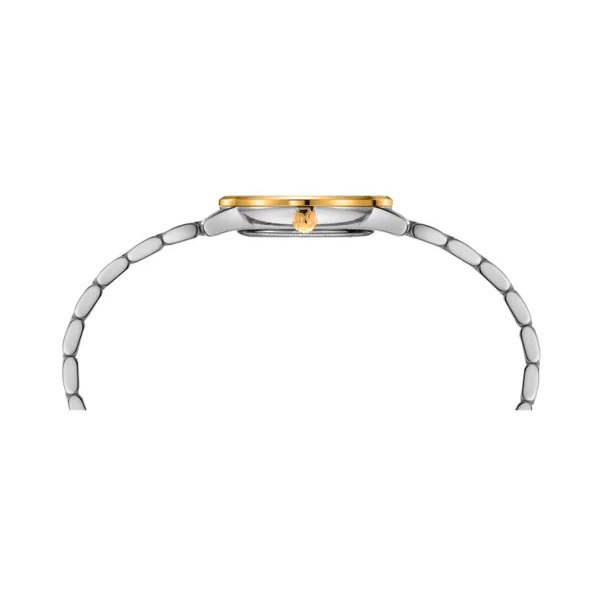 Корпус: Корпус из полированной/матовой нержавеющей стали с частичным PVD - покрытием жёлтого цвета. Металлик циферблат, золотистые стрелки и часовые индексы с люминесцентным покрытием. Сапфировое стекло. Диаметр 28 мм. Водостойкость 100 м. Система DS.
