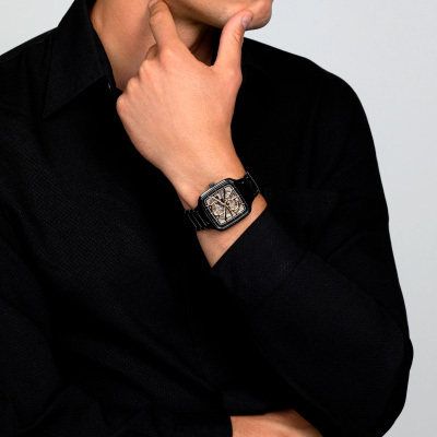 Корпус: Высокотехнологичная керамика чёрного цвета квадратной формы с корпусом моноблок. Скелетонированный циферблат чёрного цвета, золотистые стрелки и часовые индексы с люминесцентным покрытием. Сапфировое стекло с антибликовым покрытием. Прозрачная задняя крышка из сапфирового стекла. Водозащита 50 м. Размер 38 x 38 мм, толщина 9,7 мм.