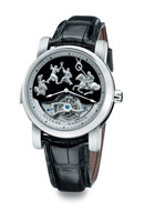 Но вернёмся к астрономическим часам. В 2009 году ULYSSE NARDIN представил инновационные часы Moonstrak с мануфактурным механизмом, детали которого выполнены из кремния. Эти часы показывают положение Солнца и Луны относительно Земли. В центре циферблата - изображение нашей планеты, которая выглядит так, как если бы мы могли смотреть на неё из космоса над Северным полюсом.