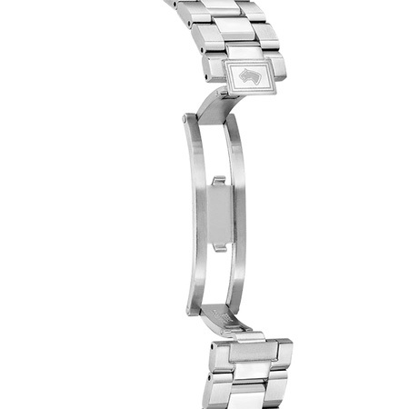 Ремешок: Нержавеющая сталь, поверхности с матовой шлифовкой - сатинированием и полировкой до зеркального блеска. Раскладывающаяся застежка с двойной кнопочной застежкой, гравировка с названием марки и ее эмблема.
