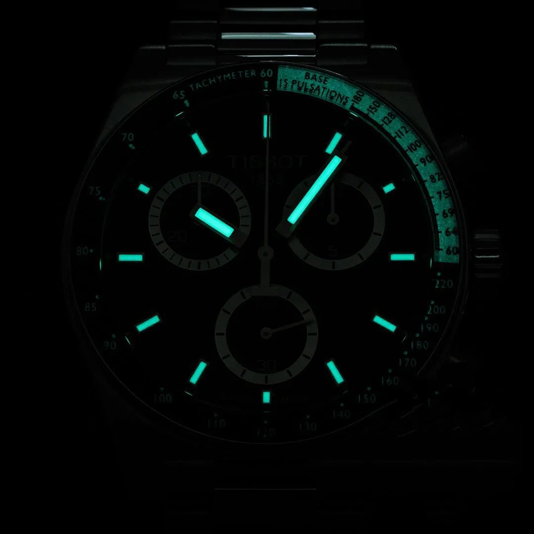 Функции: Центральные часовая, минутная стрелки и маленький секундный указатель, индикация даты. Хронограф на 30 минут с функцией ADD и SPLIT. Тахиметр.