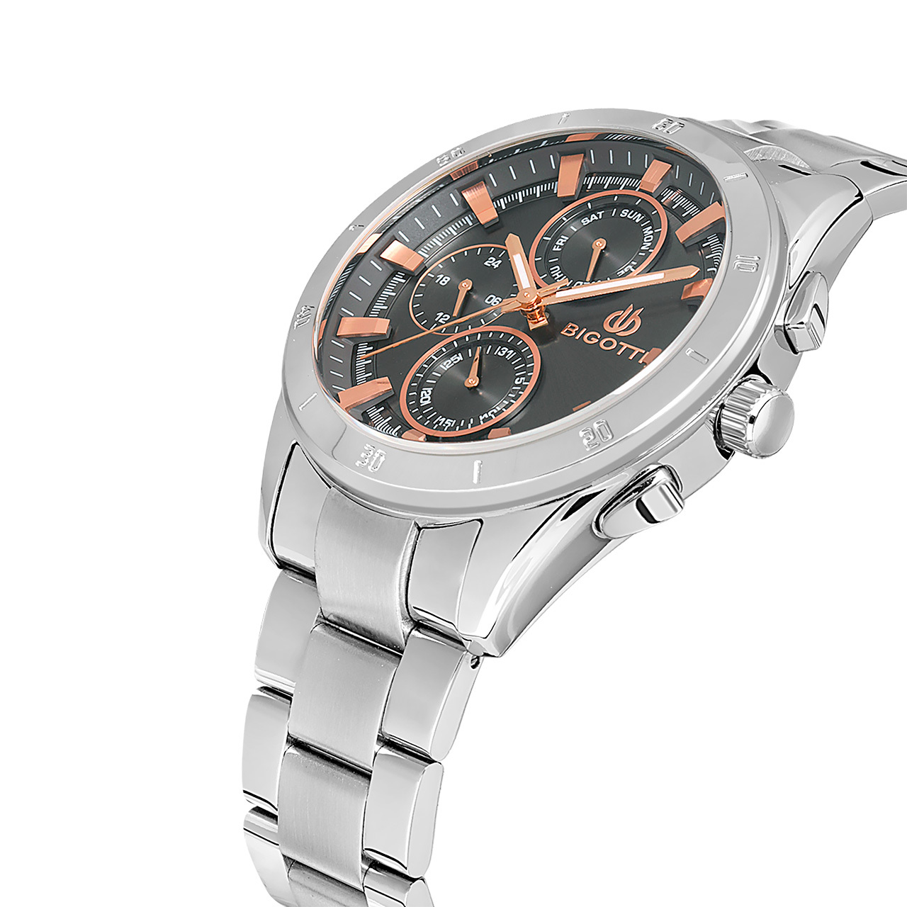 Корпус: Корпус изготовлен из латуни и имеет надёжное износостойкое покрытие серебристого цвета. Циферблат серого цвета выполнен по технологии Sunray (солнечные лучи). Позолоченные часовые индексы и стрелки. Стрелки с люминесцентным покрытием, которое позволяет легко узнать время даже в условиях низкой освещённости. Прочное минеральное стекло обеспечит защиту часов от повреждений. Диаметр: 44 мм. Водонепроницаемость: 50 м.