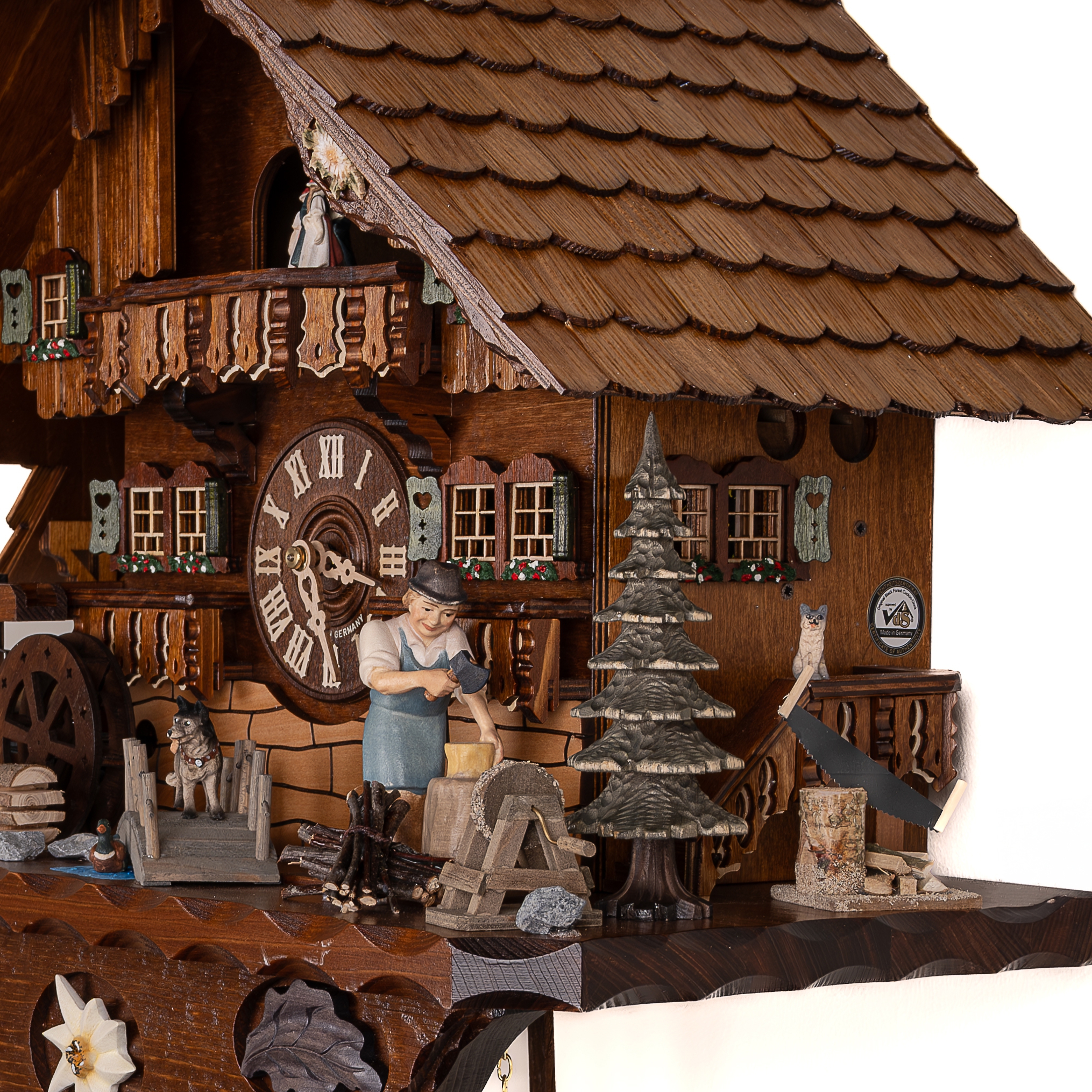 Механизм: Механические часы с кукушкой, которые работают от гирь на цепной тяге. Сделан на фирме SBS-Feintechnik GmbH & Co. KG Германия. Шварцвальдский дом с подвижным дровосеком и танцующими парами на балконе. Запас хода на 8 дней. Ручное отключение звука. В каждые пол часа кукушка появляется из своего домика, наклоняется и воспроизводит звук кукушки (ку-ку) один раз, в каждый полный час она кукует столько раз сколько показывают стрелки на часах. После этого на балкончике начинают кружиться в танце деревянные фигурки под музыку (2 мелодии чередуются). Одна гиря в данных часах отвечает за ход часового механизма, вторая за механизм кукушки, а третья за воспроизведение музыки, как в музыкальной шкатулке и движение танцующих фигурок на балконе. В то время пока кукушка кукует дровосек колет дрова и продолжает это делать пока кукушка не остановится.