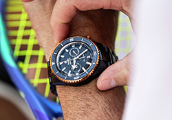 Функции: Индикация часов, минут при помощи центральных стрелок. Секундная стрелка смещена на маленький циферблат (в 6 часов). Дополнительные циферблаты хронографа: на 30 минут и 1/10 доли секунд. Окошко даты.