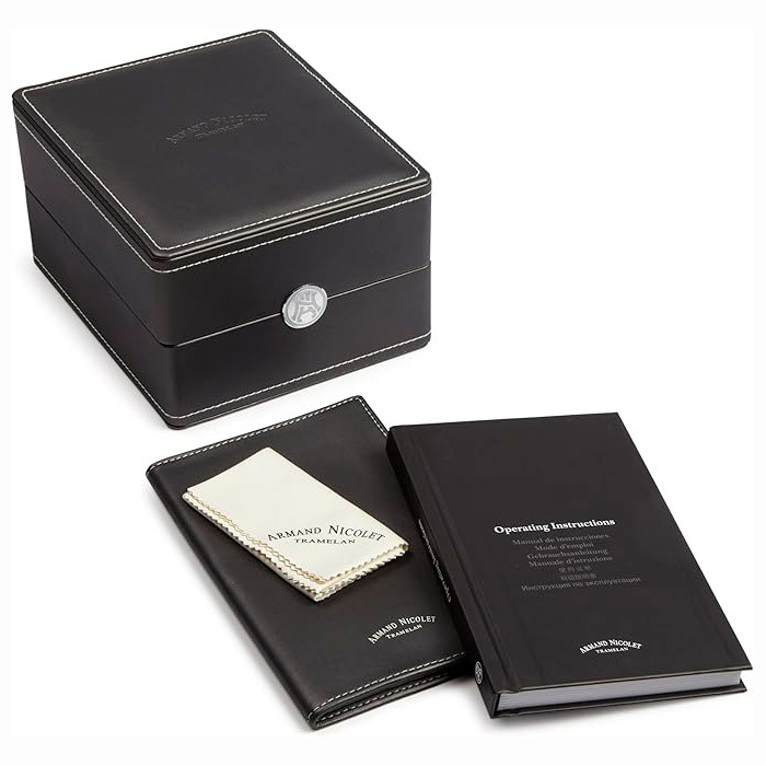 Корпус: Нержавеющая сталь 316L. Сапфировое стекло с антибликовым покрытием, прозрачная задняя крышка корпуса. Размер корпуса часов 52x38 мм, водонепроницаемость 50 метров.