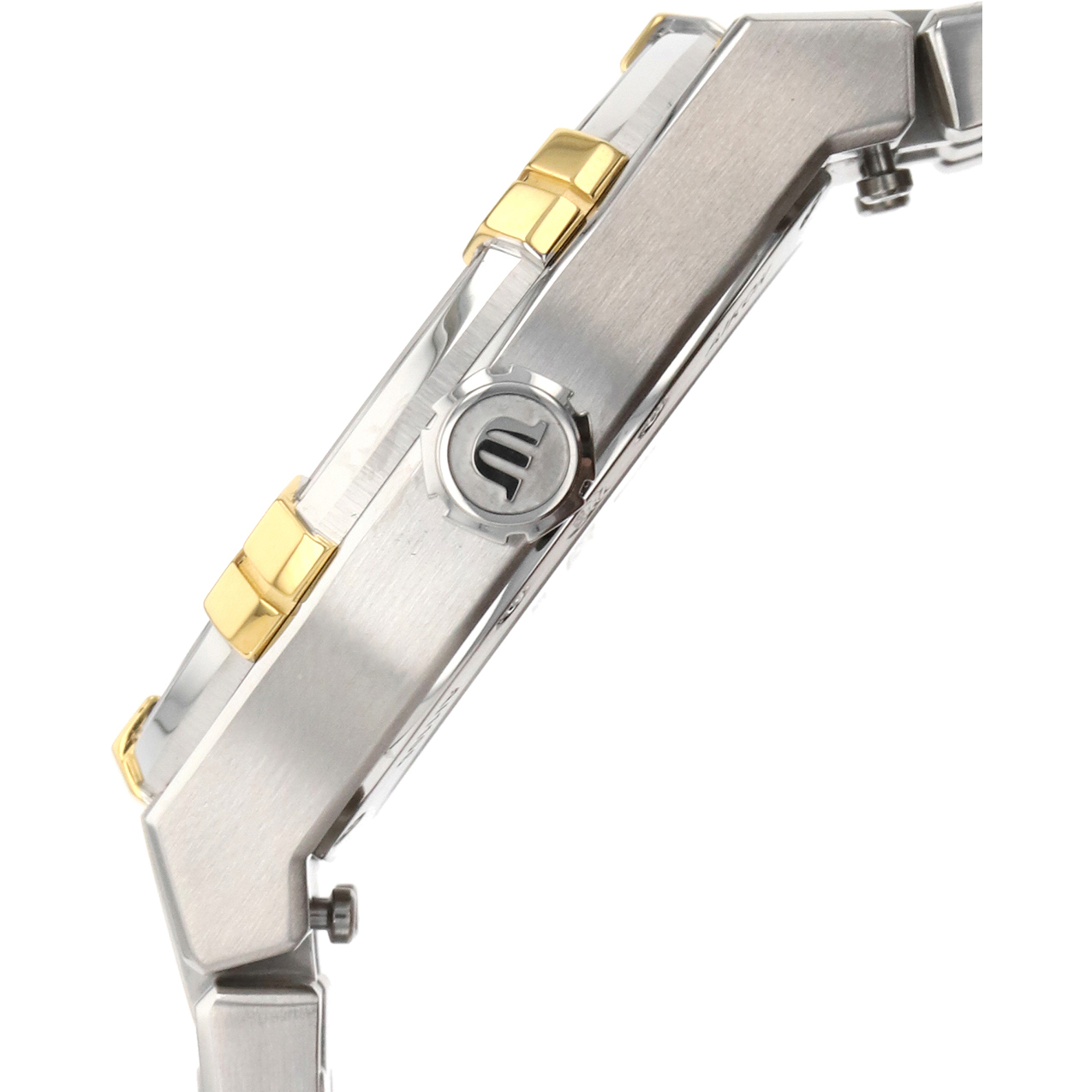Корпус: Круглый корпус выполнен из нержавеющей стали 316L, поверхность с матовой шлифовкой сатинированием и глянцевой полировкой до зеркального блеска. Выступы безеля с PVD покрытием цвета жёлтого золота. Циферблат из натурального перламутра. Аппликация часовых индексов и стрелки с алмазной огранкой имеют золотое покрытие и полировку до зеркального блеска. Часовые индексы украшены бриллиантами. Стрелки с люминесцентным покрытием Super-Luminova, которое светится в темноте после непродолжительной зарядки на свету. Сапфировое стекло с антибликовым покрытием защищает циферблат от царапин и обеспечивает отличную читаемость при любом освещении. Завинчивающаяся заводная головка с фирменным логотипом. Диаметр корпуса составляет: 35 мм. Водостойкость: 10 ATM.