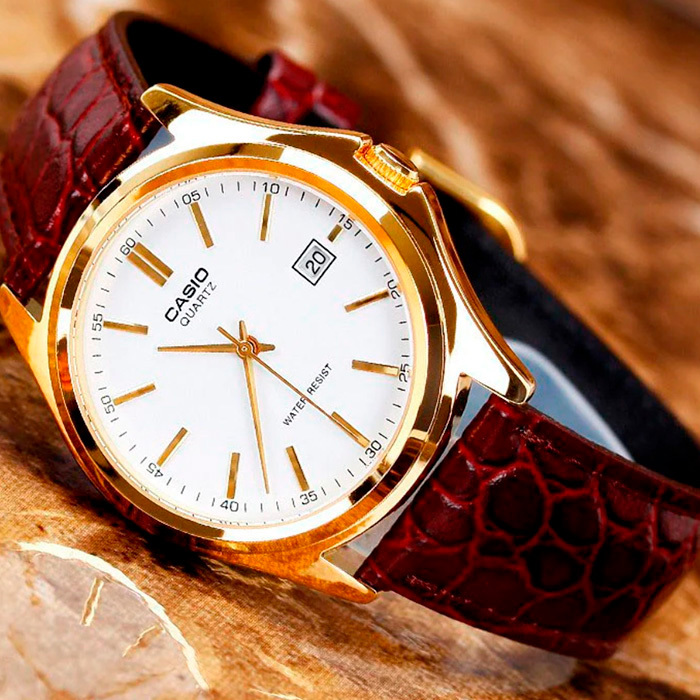 Ремешок: Кожаный ремешок коричневого цвета, стандартная застежка.