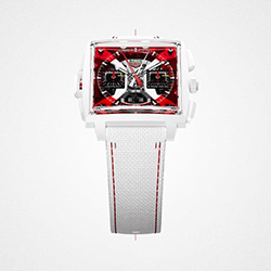 Корпус из белой керамики и сапфирового стекла подчеркивает технический стиль модели и лёгкость конструкции. Полупрозрачный красный циферблат, асфальтовая текстура счётчиков и культовая фраза Дэвида Крофта «ГАСИМ СВЕТ и УХОДИМ» создают атмосферу настоящего старта гонки. Сквозь прозрачную заднюю крышку виден механизм ручной работы - символ страсти и инженерной точности TAG Heuer.