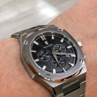 Функции: Центральные часовая и минутная стрелки, маленький секундный индикатор на «3 часах». Апертура даты находится в положении 3 часа. Хронограф с центральной секундной стрелкой.