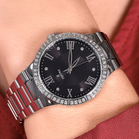 Корпус: Ударопрочный корпус часов сделан из нержавеющей стали. Циферблат чёрный с серебристыми стрелками и часовыми индексами в виде точек и римских цифр. Корпус и циферблат украшен кристаллами. Минеральное стекло устойчивое к возникновению царапин. Рифленая заводная головка. Диаметр: 36,5 мм. Водонепроницаемость: 50 м.
