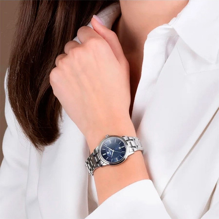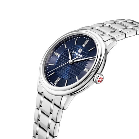 Корпус: Корпус часов изготовлен из стали 316L. Синий гильошированный циферблат, украшен кристаллами Swarovski. Стрелки и часовые индексы стальные. Закалённое минеральное стекло с сапфировым покрытием.  Диаметр корпуса: 34 мм. Водозащита до 50 метров позволит принимать душ или умываться, не снимая часов.