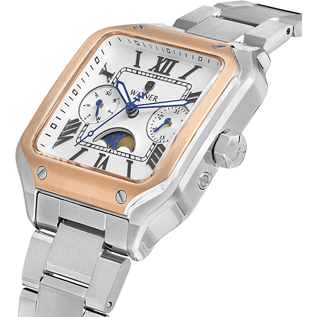 Корпус: Квадратный корпус из нержавеющей стали 316L с частичным PVD покрытием. Циферблат серебристого цвета. Метки в виде штрихов и римских цифр. Секундная стрелка на конце декорирована буквой W. Сапфировое стекло устойчивое к появлению царапин. Граненая заводная головка с защитой украшена фирменным логотипом. Размер корпуса 32х32 мм, . Водонепроницаемость 30 метров.