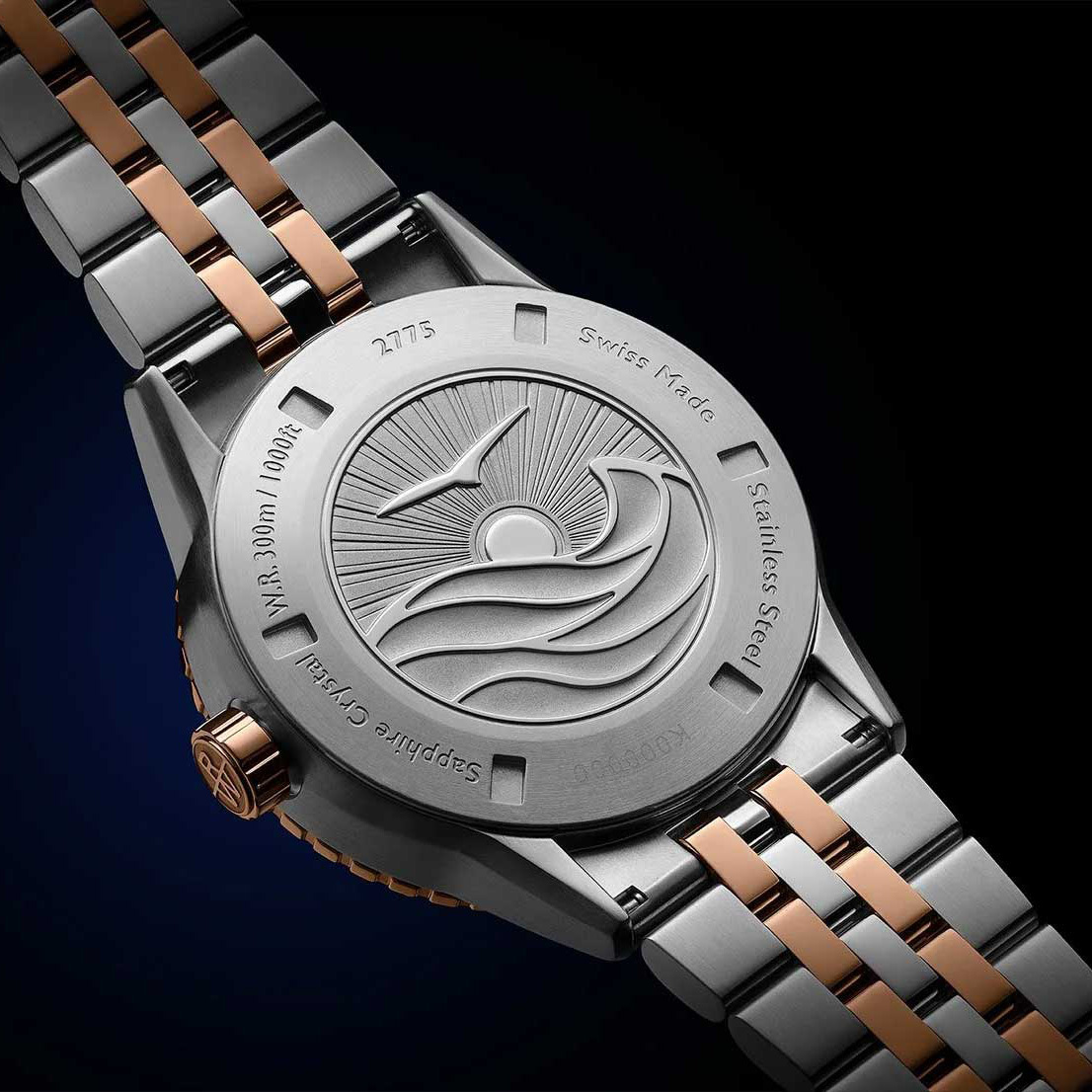 Корпус: Корпус изготовлен из полированной нержавеющей стали. Керамический безель вращается в одном направлении. Градиентный циферблат чёрного цвета с накладными метками в виде штрихов. Метки и стрелки с люминесцентным покрытием SuperLuminova, которое светится в темноте после непродолжительной зарядки на свету. Сапфировое стекло с двусторонним антибликовым покрытием. Завинчивающаяся задняя крышка с гравировкой водного пейзажа, олицетворяющего свободу, ощущаемую на воде, а также независимый дух. Завинчивающаяся заводная головка с монограммой RW. Диаметр: 42,5мм, толщина 11,7мм. Водозащита: 300WR.