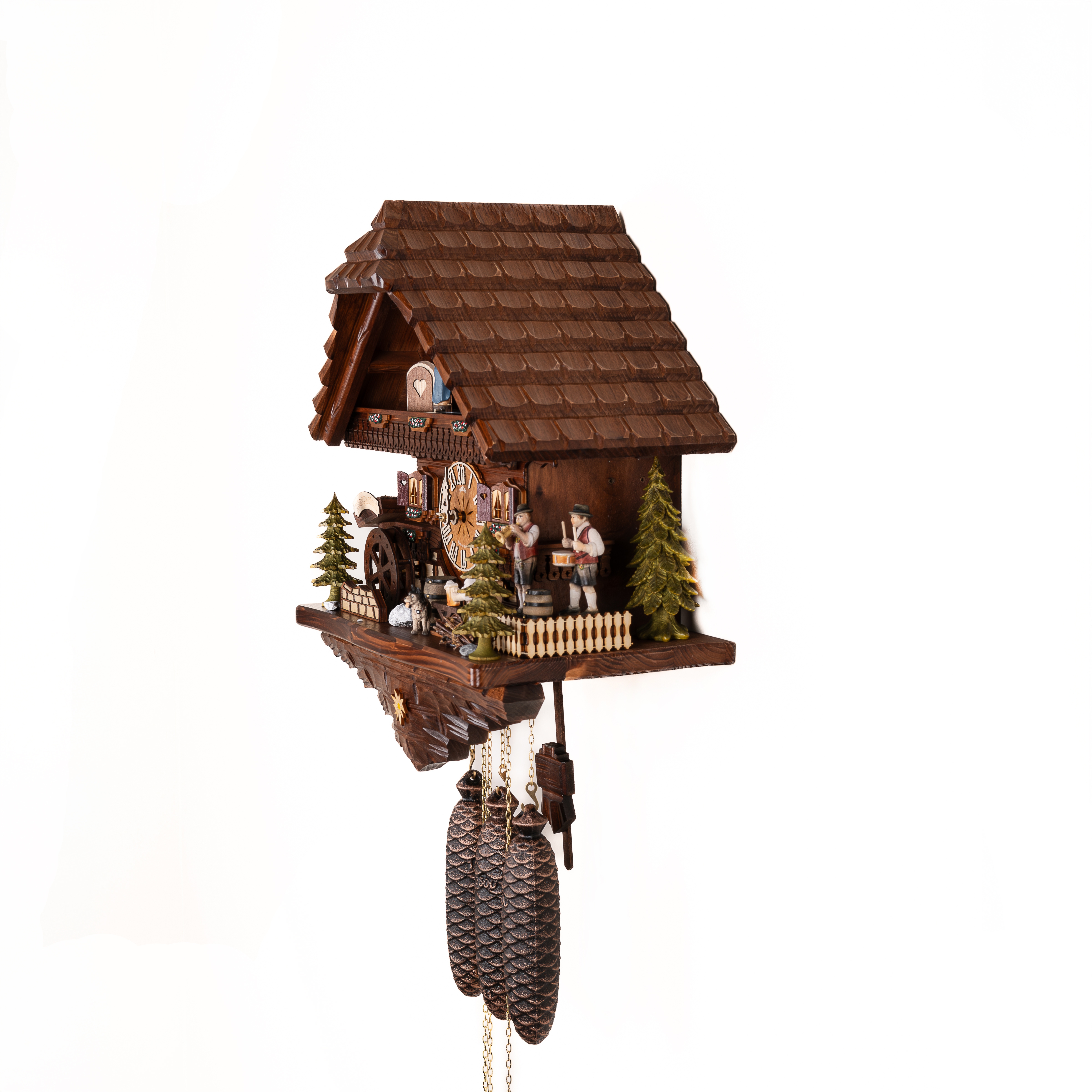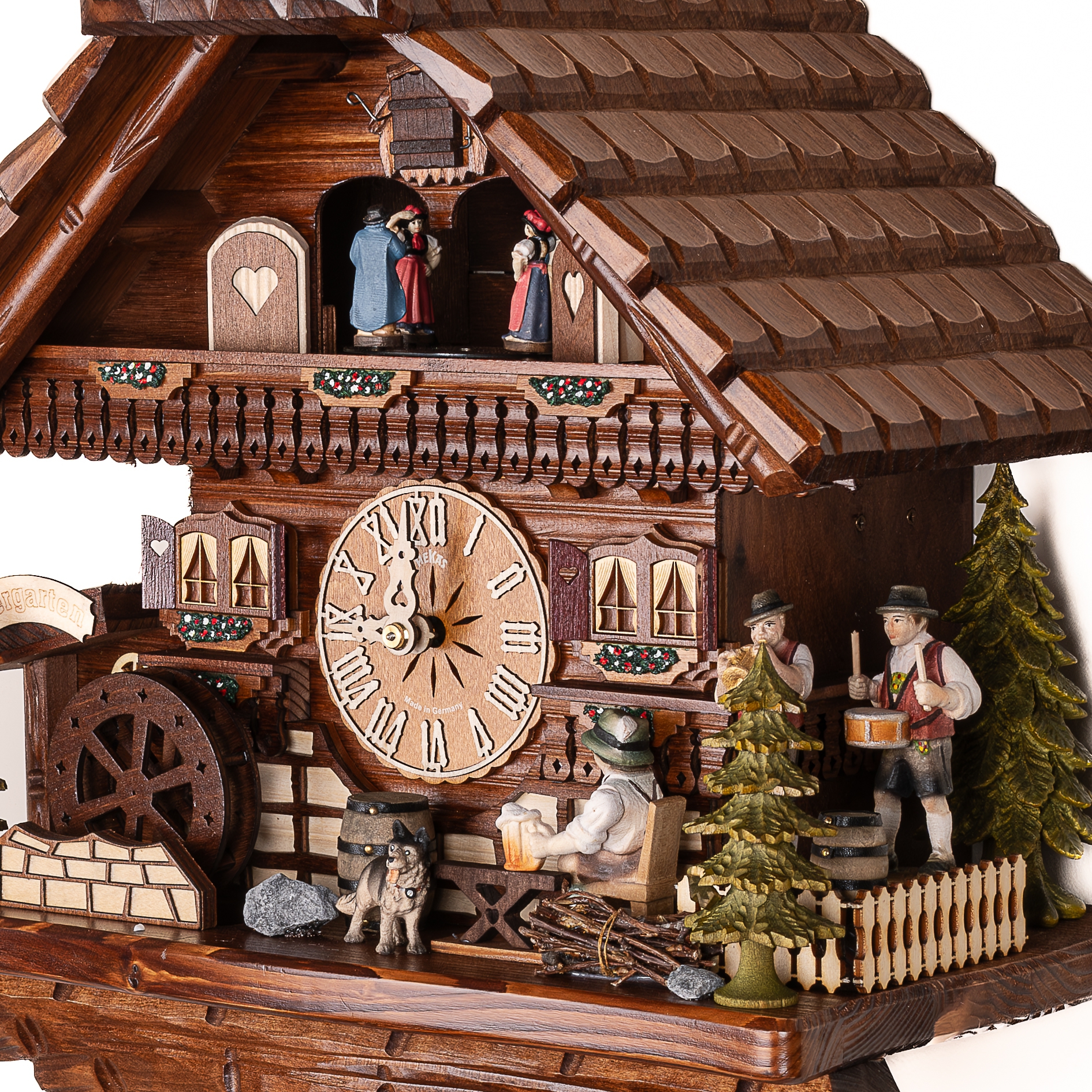 Механизм: Механические часы с кукушкой, которые работают от гирь на цепной тяге. Сделан механизм на фирме SBS-Feintechnik GmbH & Co. KG Германия. Шварцвальдский дом с подвижным человеком, пьющим пиво, крутящимся мельничным колесом и танцующими парами на балконе. Запас хода на 8 дней. Ручное отключение звука. В каждые пол часа кукушка появляется из своего домика, наклоняется и воспроизводит звук кукушки (ку-ку) один раз, в каждый полный час она кукует столько раз сколько показывают стрелки на часах. После этого на балкончике начинают кружиться в танце деревянные фигурки под музыку (2 мелодии чередуются). Одна гиря в данных часах отвечает за ход часового механизма, вторая за механизм кукушки, а третья за воспроизведение музыки, как в музыкальной шкатулке, и за движение декоративных фигурок, водяной мельницы, танцующих пар на балконе.