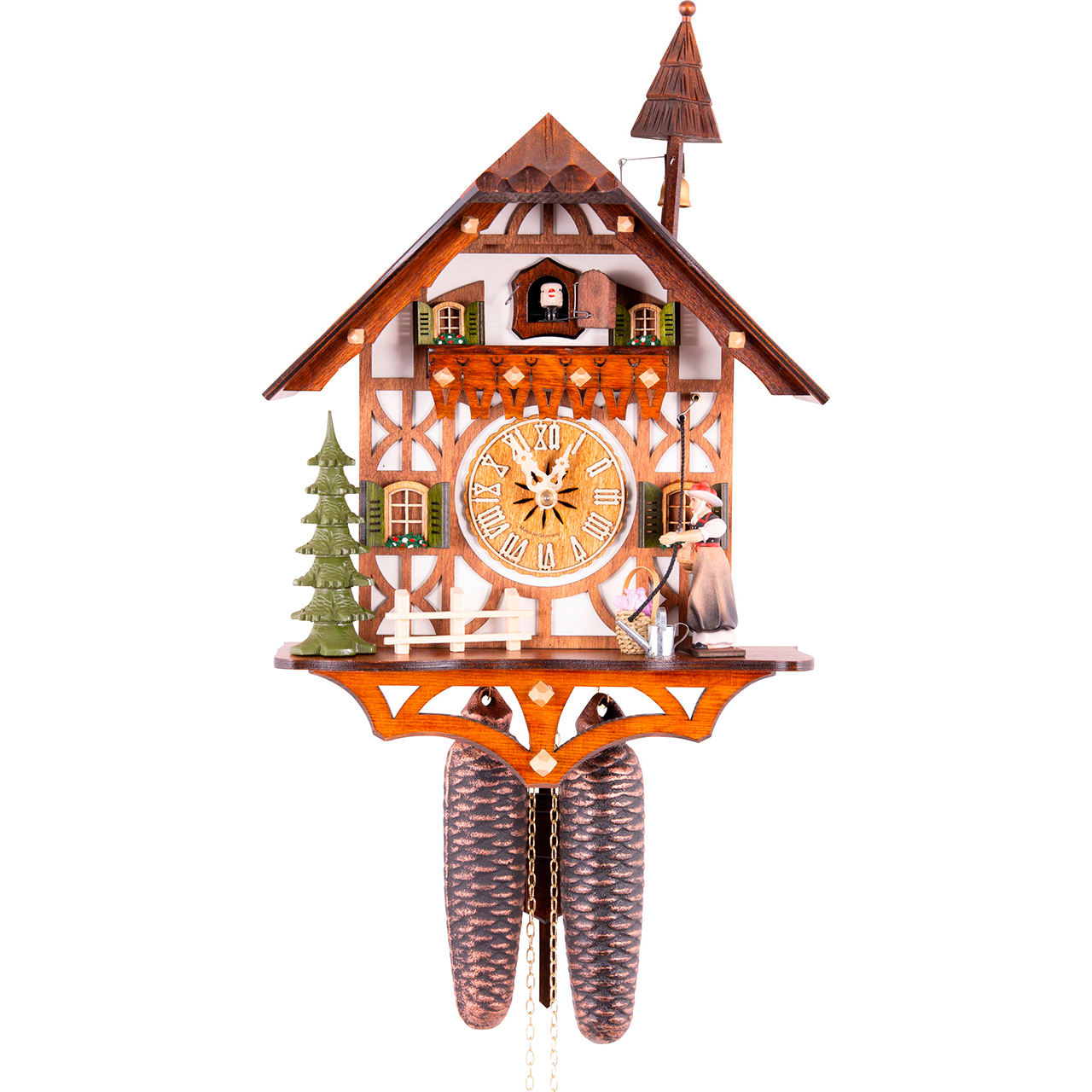 Механизм: Механические часы с кукушкой, которые работают от гирь на цепной тяге. Сделан на фирме SBS-Feintechnik GmbH & Co. KG Германия. Шварцвальдский дом со звонарём. Запас хода на 8 дней. Ручное отключение звука. В каждые пол часа кукушка появляется из своего домика, наклоняется и воспроизводит звук кукушки (ку-ку) один раз, в каждый полный час она кукует столько раз сколько показывают стрелки на часах. Одна гиря отвечает за ход часов, вторая за работу механизма кукушки и звоноря.
