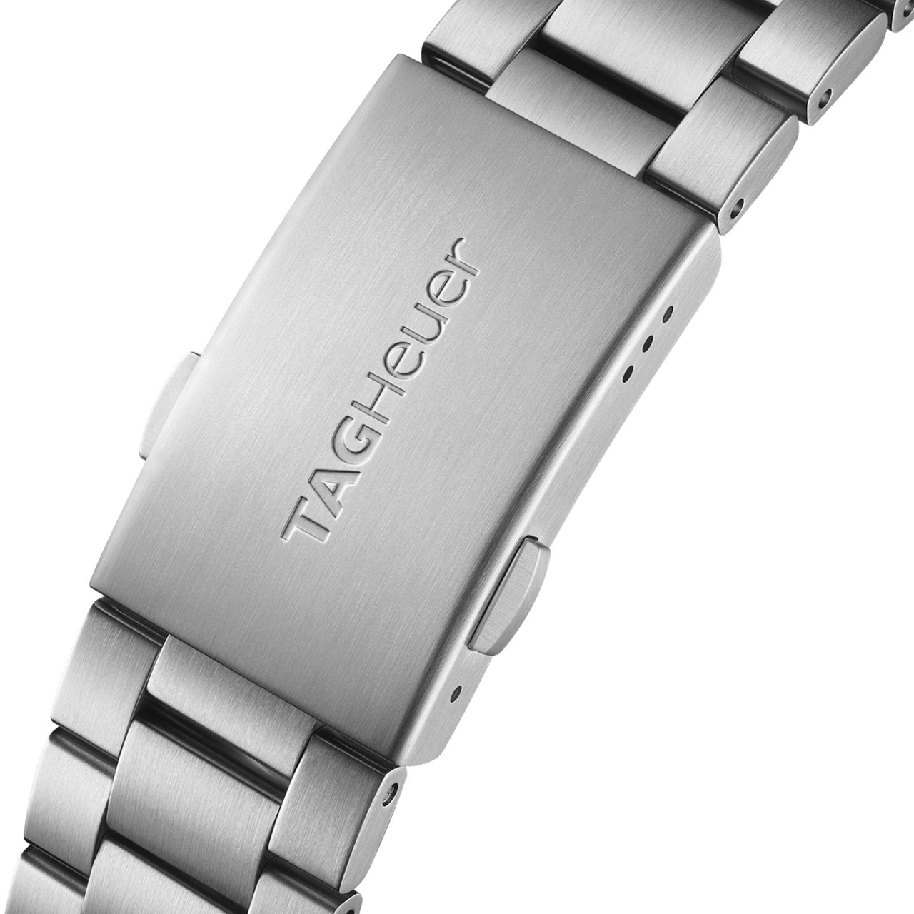 Ремешок: Литой браслет из высококачественной нержавеющей стали с 3 рядами звеньев, ширина 21,5 мм, раскладывающаяся браслетная застежка с системой удлинения и дополнительным фиксатором, предохраняющим от произвольного расстегивания, украшена логотипом TAG Heuer.