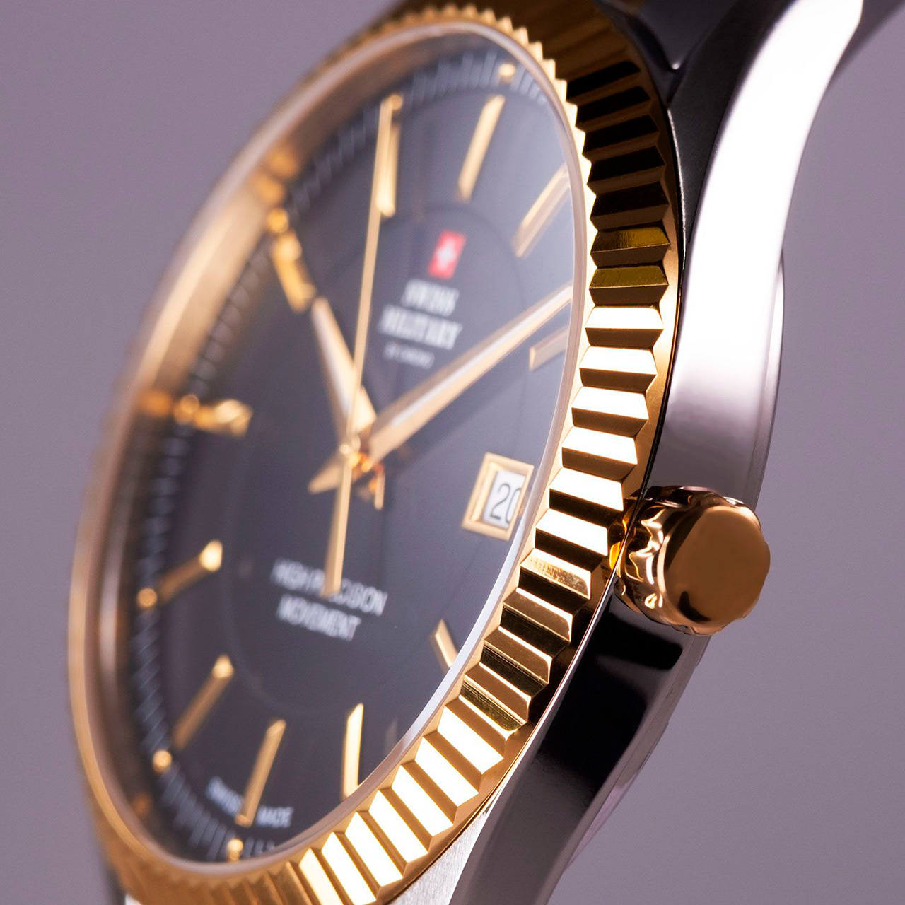 Корпус: Корпус выполнен из нержавеющей стали с частичным PVD покрытием цвета желтого золота. Чёрный циферблат. Минеральное стекло с сапфировым покрытием. Водонепроницаемость 50 метров. Диаметр 40 мм.