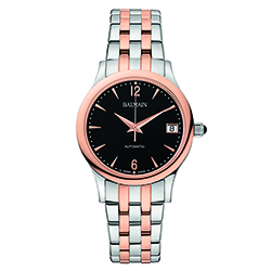 | 6. Classic R Automatic B.3988.33.64: стальной корпус с PVD-покрытием розовым золотом, стальной браслет с PVD-покрытием розовым золотом чётных звеньев; чёрный циферблат, украшенный гильоше в стиле «солнечные лучи» (Rayonne) с арабскими цифрами 6, 12 и десятью условными индексами с PVD-покрытием розовым золотом. |