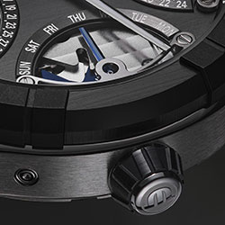 Антрацитовый циферблат с вертикальной шлифовкой дополнен скелетонизированными элементами, через которые видна родированная платина механизма. Внутри работает мануфактурный автоматический калибр ML291, украшенный классическим декором Côtes de Genève.